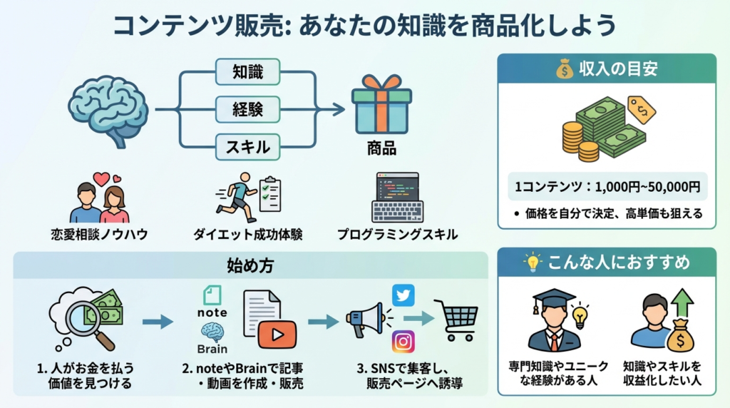コンテンツ販売とは、あなたの知識や経験、スキルを「商品」として販売することです。恋愛相談のノウハウ、ダイエットの成功体験、プログラミングスキルなど、形のないものも商品になります。