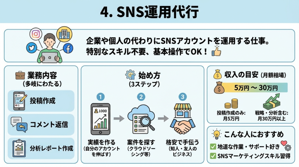SNS運用代行とは、企業や個人の代わりにSNSアカウントを運用する仕事です。投稿作成、コメント返信、分析レポート作成など、業務内容は多岐にわたります。特別なスキルがなくても、SNSの基本操作ができれば始めやすいのが特徴です。