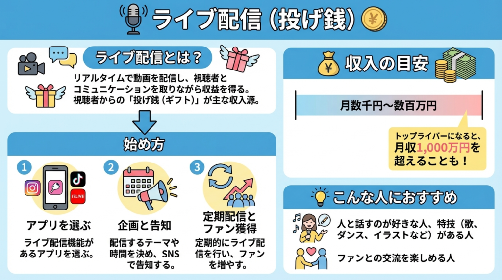 ライブ配信とは、リアルタイムで動画を配信し、視聴者とコミュニケーションを取りながら収益を得る方法です。視聴者からの「投げ銭(ギフト)」が主な収入源となります。