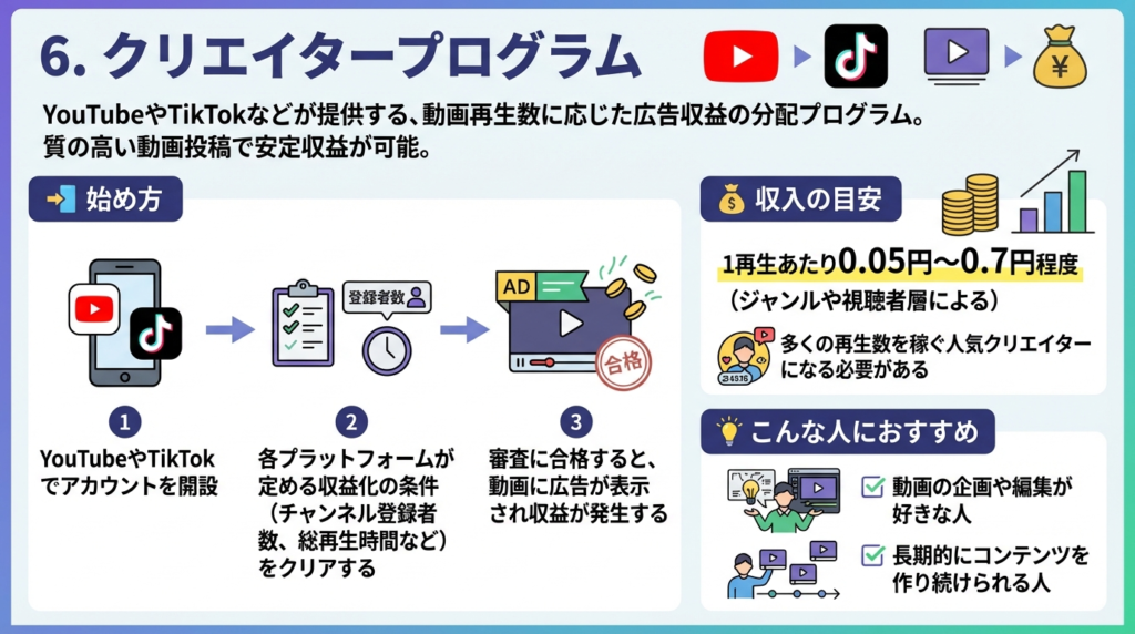 クリエイタープログラムとは、YouTubeやTikTokなどが提供する、動画再生数に応じた広告収益の分配プログラムです。質の高い動画を投稿し続けることで、安定した収益を得ることが可能です