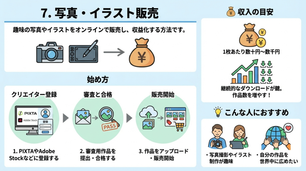 自分で撮影した写真や制作したイラストを、オンラインで販売する方法です。趣味で撮りためた写真や、得意なイラストが収益に繋がる可能性があります。