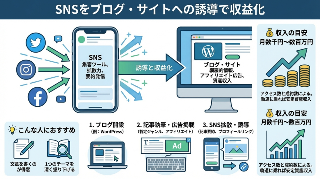 SNSを「集客ツール」として活用し、自身が運営するブログやウェブサイトへ読者を誘導して収益化する方法です。SNSの拡散力と、ブログの網羅的な情報提供力を組み合わせることで、大きな収益を目指せます。