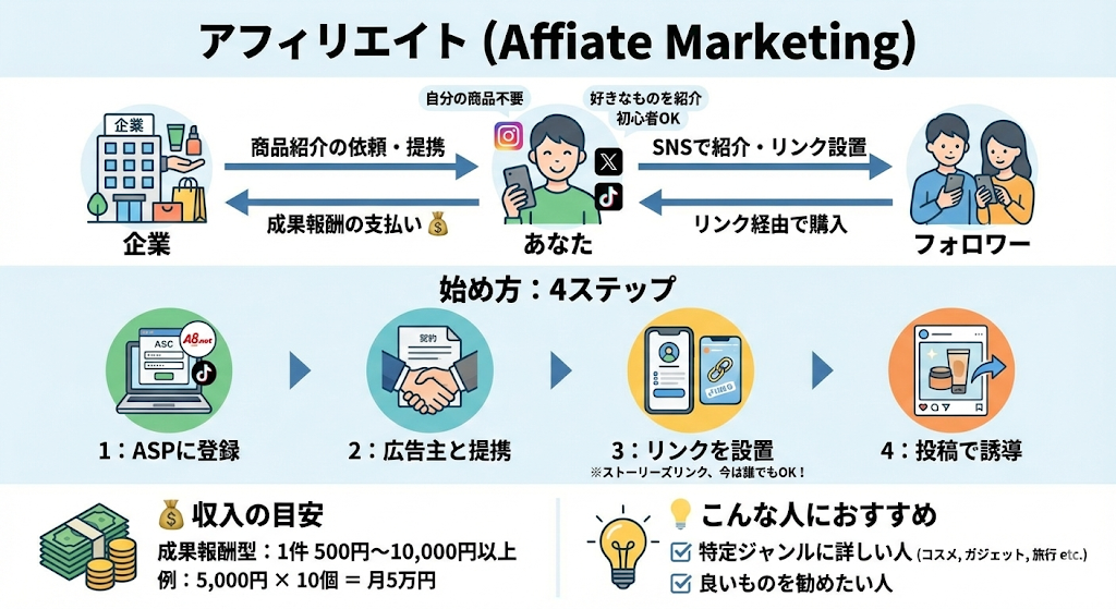 アフィリエイトとは、企業の商品やサービスをあなたのSNSで紹介し、その投稿経由で商品が売れると、あなたに報酬が支払われる仕組みです。自分の商品を持つ必要がなく、好きなものを紹介できるため、初心者でも始めやすいのが特徴です。