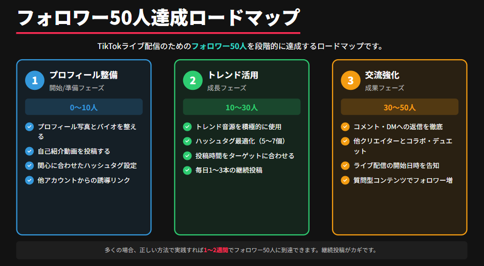 A. 質の高いコンテンツを毎日投稿すれば、通常1-2週間で達成可能です。トレンドを意識し、ハッシュタグを効果的に使用することで、さらに短縮できます。 - Q. 配信中にコメントが来ない場合はどうすればいいですか?