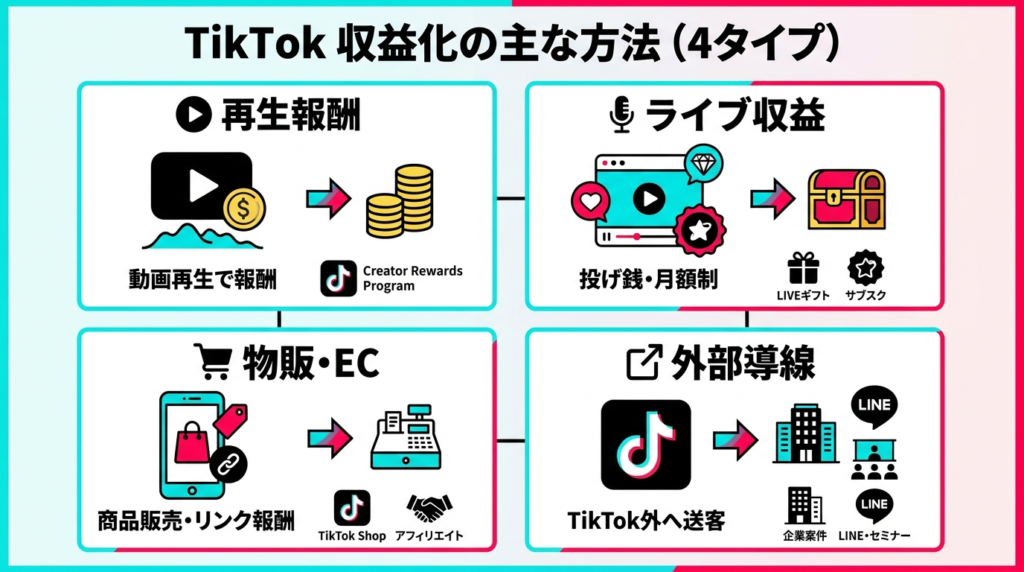 | 物販・EC | TikTok Shop・アフィリエイト | 商品販売やリンク報酬 |