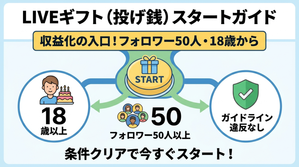 LIVEギフトはフォロワー50人・18歳以上から始められるため、収益化の入口として使いやすい方法です。