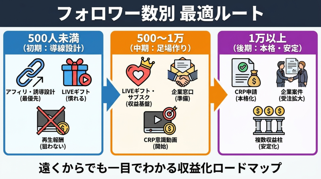 | 月10万円 | 複数柱(CRP+案件+LIVE) | フォロワー2〜3万人以上・月間有効視聴数100万回以上が目安 |