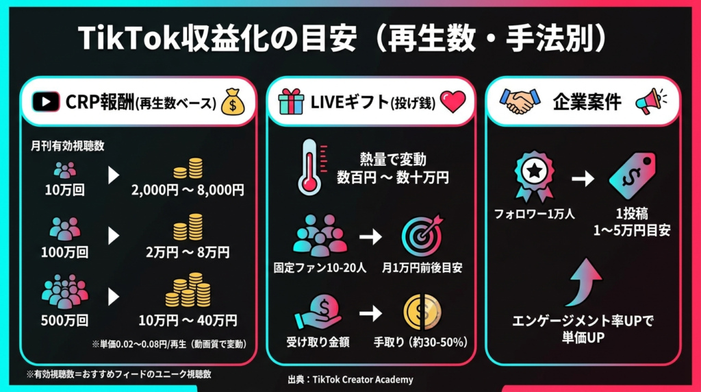 フォロワー50人以上ならLIVEギフト、フォロワー不問ならアフィリエイト・TikTok Shop・外部LINE誘導が今日から動けます。CRP(再生報酬)はフォロワー1万人・30日間10万再生が条件で、一番ハードルが高い方法です。条件が揃っていない段階でCRPだけを狙うのは非効率です。