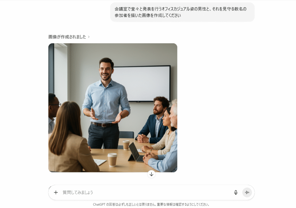 たとえば、「会議室でオフィスカジュアルの男性がプレゼンしている様子を画像で作ってください」と入力するだけで、以下のようなビジュアルを自動生成してくれます。
