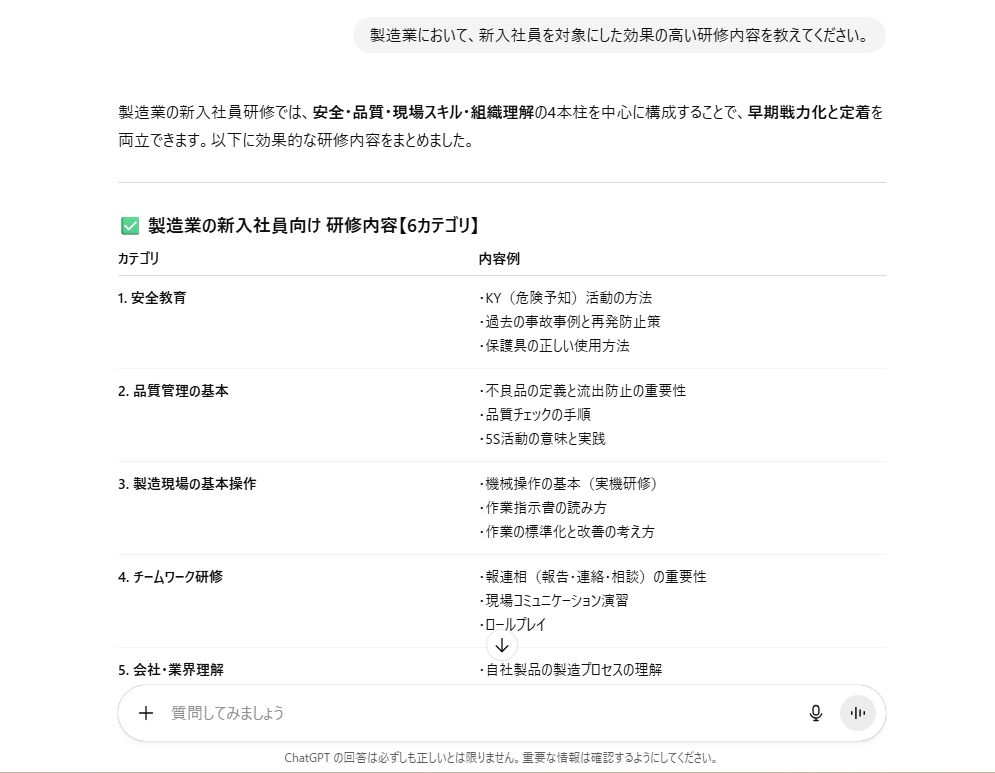 教育・研修資料の構成案を考える際にも便利です。たとえば、新人教育や社内講座の内容案を複数提示してもらえます。