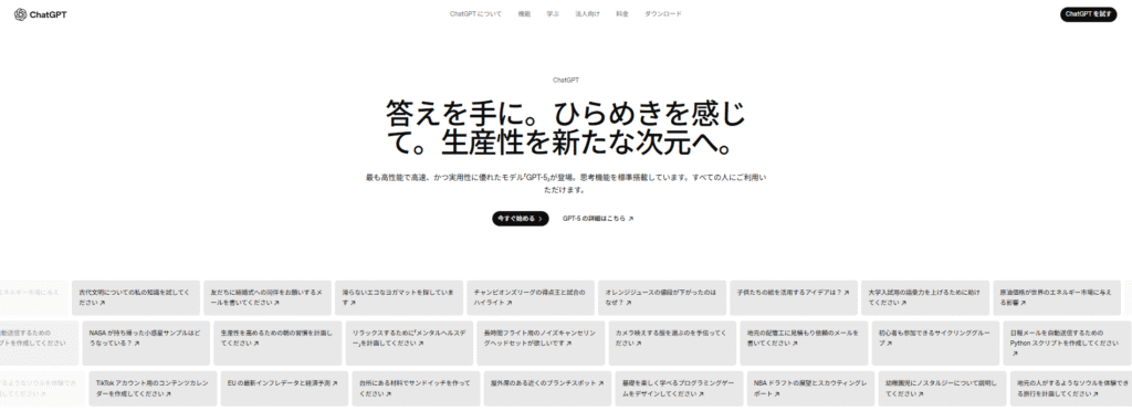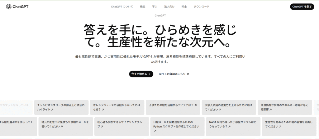 1.まず、ChatGPTの公式ページにアクセスし、OpenAIのアカウント作成を開始します。トップページにある[今すぐ始める]をクリックしましょう。