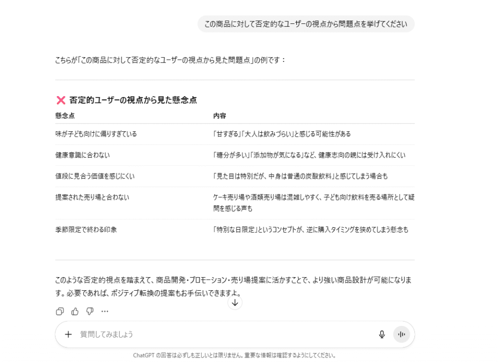 たとえば「アンチユーザーとして見たときに、この提案の問題点は?」と指示すれば、懸念点や疑問を洗い出してくれます。