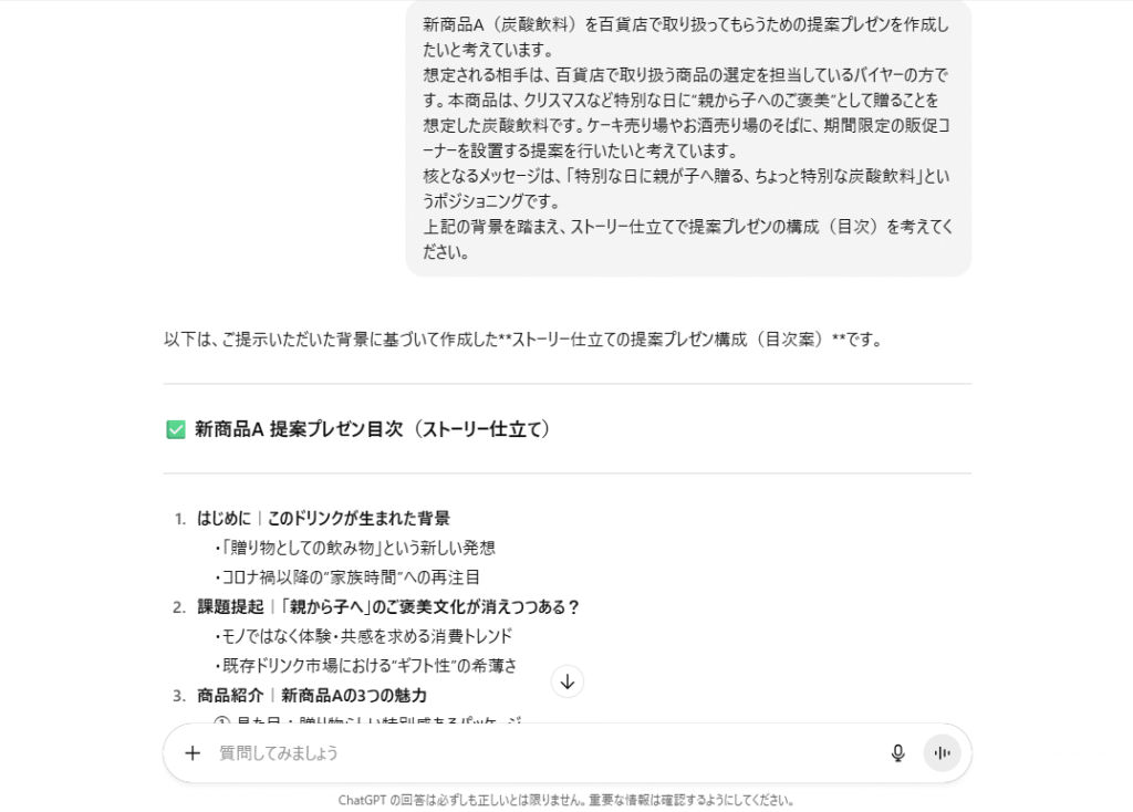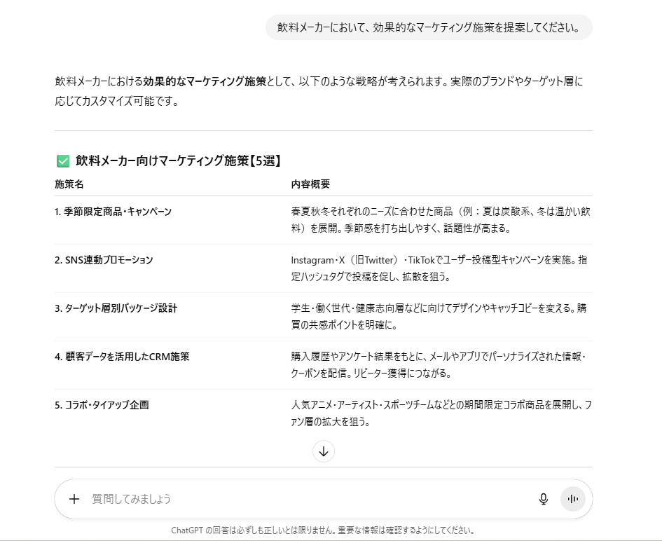 マーケティング施策のブレスト支援にも活用可能です。たとえば、商品販促やターゲット戦略の案を出すよう指示すれば、具体的な切り口を複数提示してくれます。