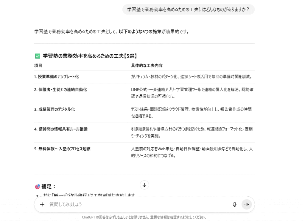 たとえば、下図は学習塾の現場でChatGPTに業務改善策を提案させたケースです。