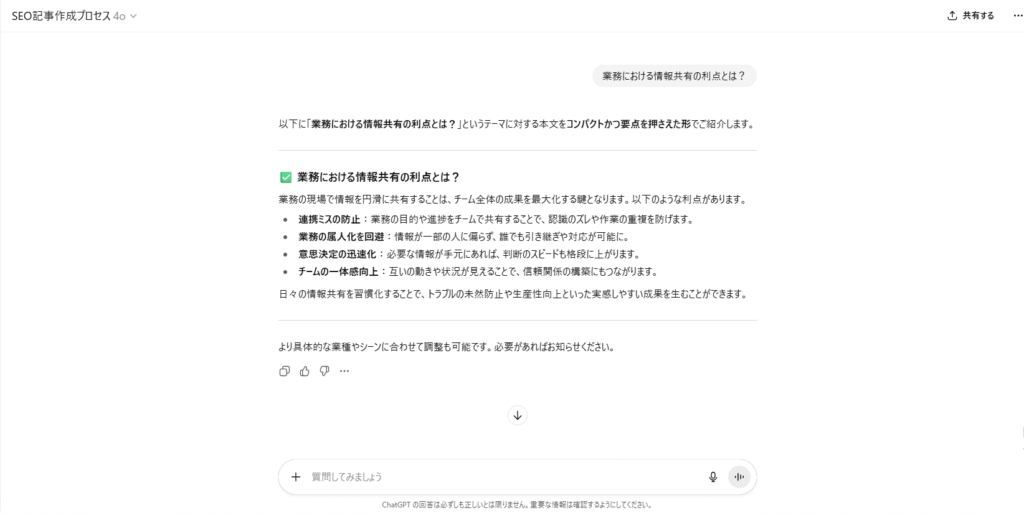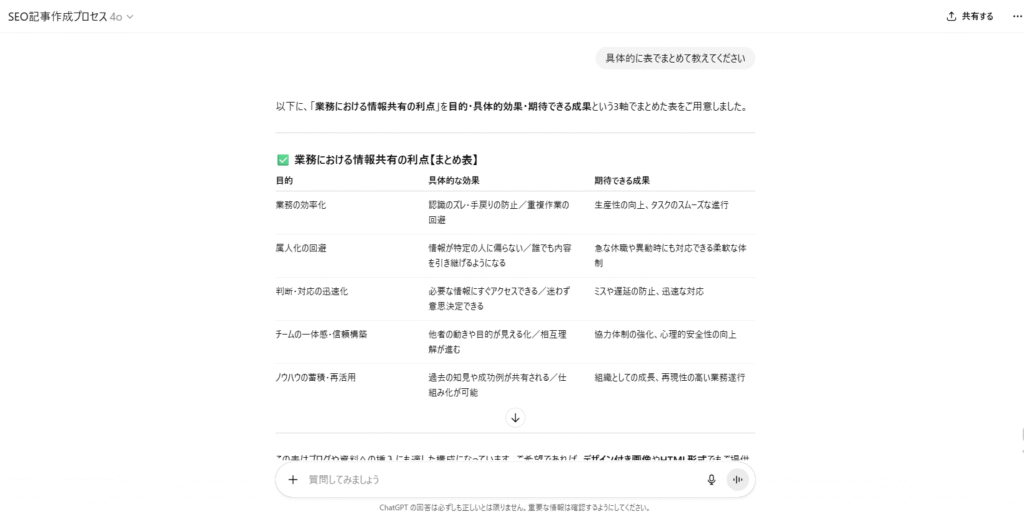 テンプレートの自動作成や、コード生成、マーケティングのアイデア出しなど、さまざまな業務に対応できる柔軟さが魅力です。一方で、チャット形式ならではの課題として、重要な情報が流れてしまいやすいという側面もあります。