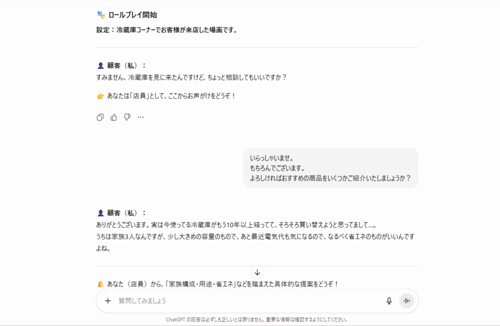 たとえば、「店舗スタッフとお客様」などのシナリオを設定すると、その状況に応じた会話のやり取りをシミュレーションできます。