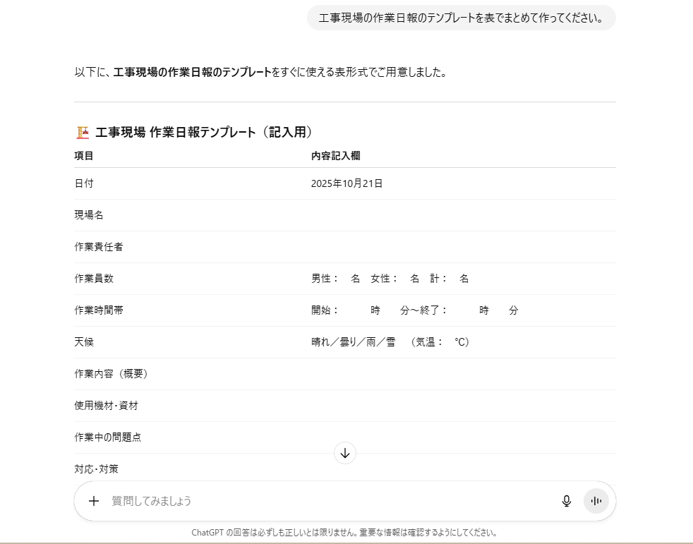 最初に紹介するのは、業務用テンプレートの作成です。たとえば、作業日報や報告書のフォーマットを自動生成できます。