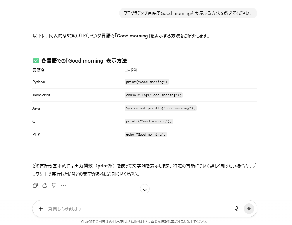 無料プランでも、「文章の生成」「要約」「関数やプログラミングコードの作成」など、基本的なやり取りが可能です。簡単な質問や日常業務の補助には十分対応できます。