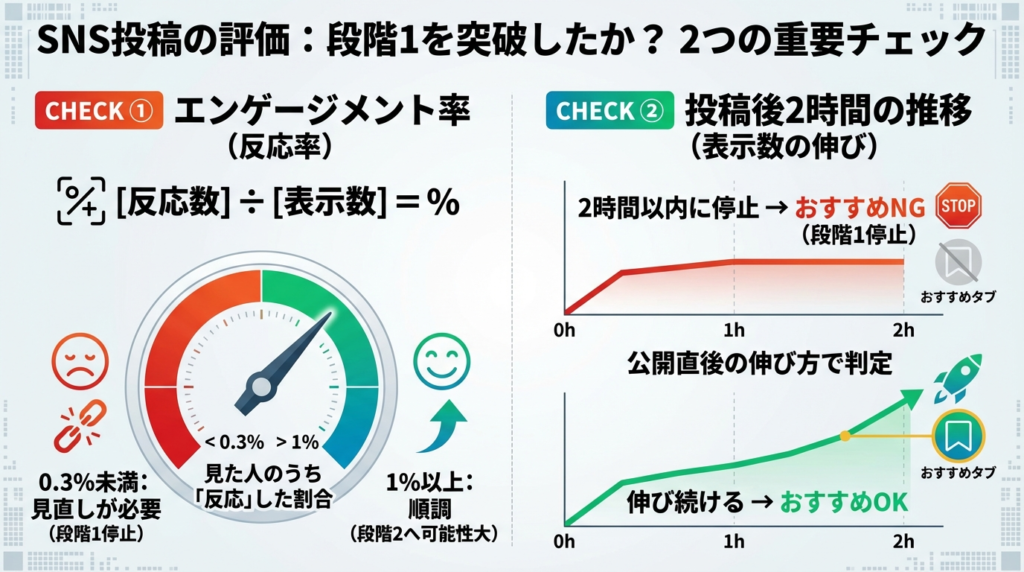エンゲージメント率とは「投稿を見た人のうち、何%が何かしら反応したか」という数値です。これが低いほど段階1で止まっています。目安として1%を超えていれば段階2に進んでいる可能性が高く、0.3%未満が続くなら投稿内容・書き出しの見直しが先です。
