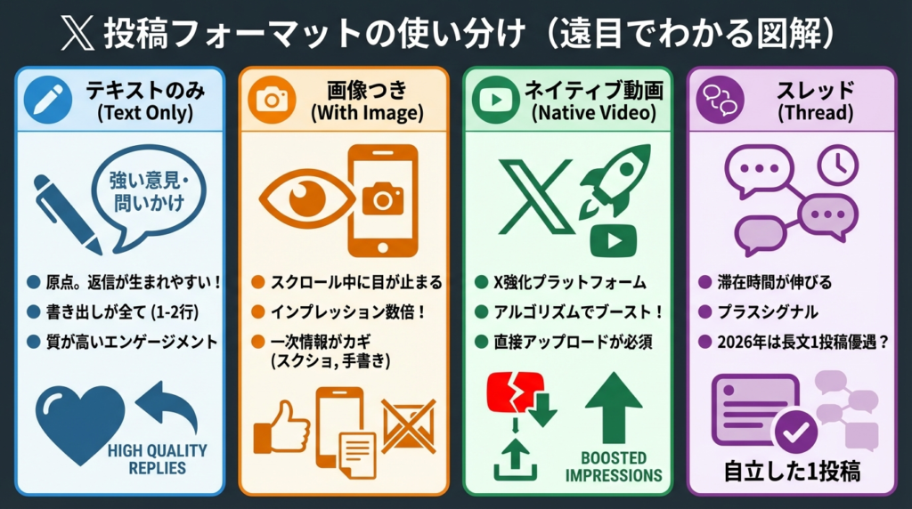 Xの原点であり、最も返信が生まれやすいフォーマットです。強い意見・問いかけ・逆説的な主張と相性が良い。書き出しの1〜2行で読者が止まるかどうかが全てを決めます。アルゴリズムからの配信ブーストはないものの、返信というエンゲージメントの質が最も高くなりやすいのがこの形式です。