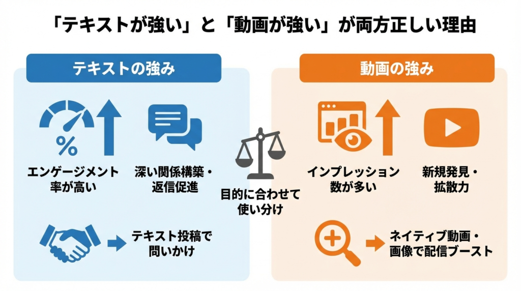 エンゲージメント率(反応した人の割合)で見るとテキストが高く、インプレッション数(見られた回数)で見ると動画が多い傾向があります。