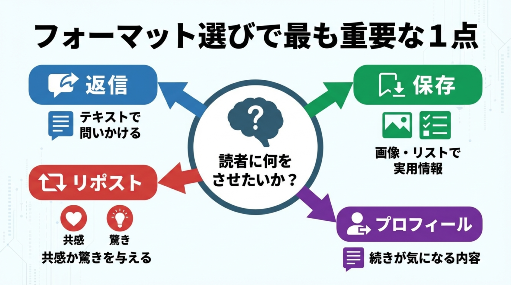 フォーマットはその答えが出た後で選ぶものです。動画を作るべきかどうか悩む前に、まず「この投稿で読者に何をしてほしいか」を1行で言えるかを確認してください。