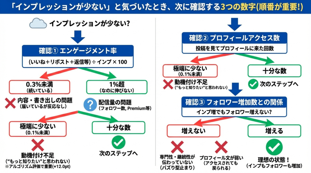 1%を超えているのにインプレッションが伸びていないなら、配信量自体の問題です。フォロワー数の少なさやTweepCred、Premiumの有無を疑います。