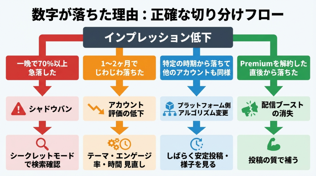 「数字が落ちた=シャドウバン」と判断するより、まず通常のアルゴリズム要因を疑う方が正確だよ!