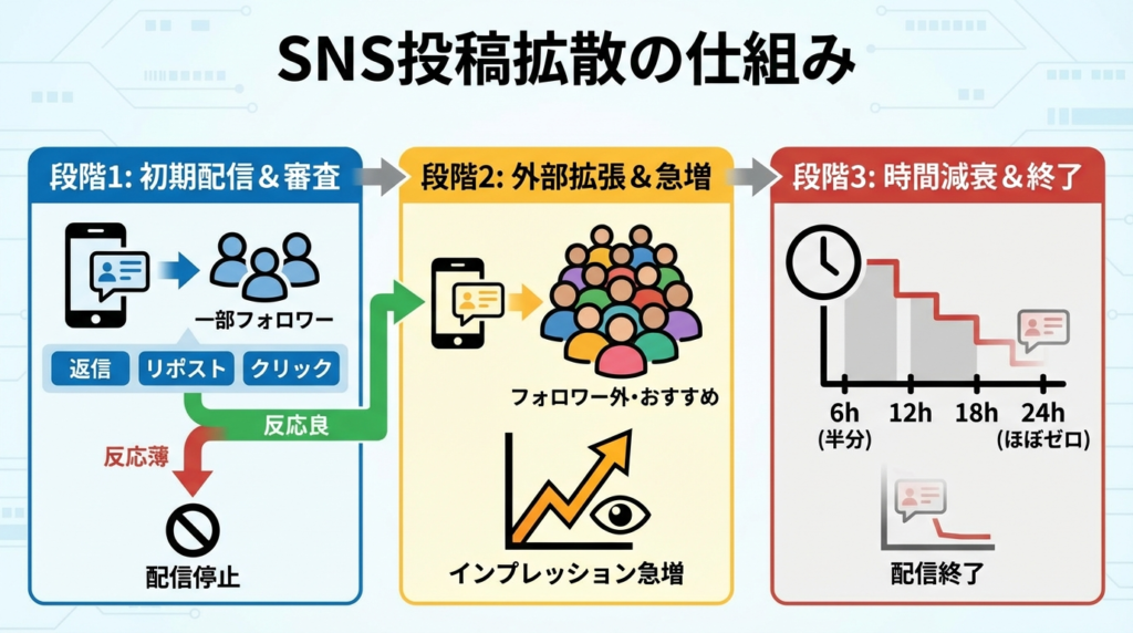 まず一部のフォロワーへ流れる。ここでの返信・リポスト・プロフィールクリックが審査になる。反応が薄ければここで配信が止まる。