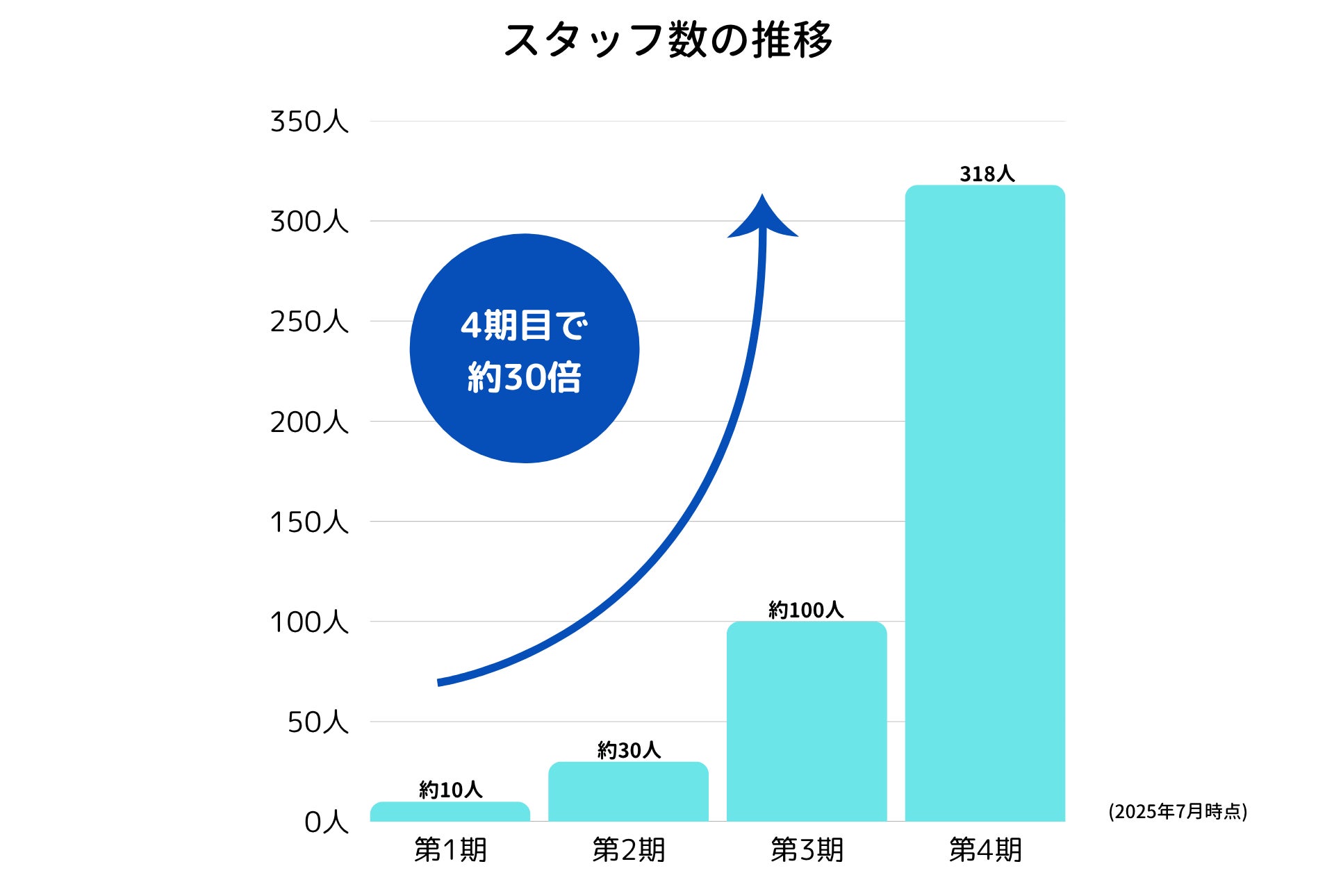 WebマーケティングやSNS・広告運用、生成AI、セールス、デザインなど、実践的なスキルを効率よく習得できる次世代型のオンライン教育プログラム「スキルプラス」を提供するアドネス株式会社(本社:東京都新宿区四谷、代表取締役社長:三上功太)は、2025年7月より第5期目の事業年度を迎えました。第3期に約100名だったスタッフ数は、第4期には318名へと約3倍に拡大。過去最多となる200名超の採用を実現し、人員体制のスケールアップを果たしました。さらに、第5期初月となる2025年7月には、すでに73名の新メンバーが加わり、勢いそのままに事業と組織の拡大を続けています。